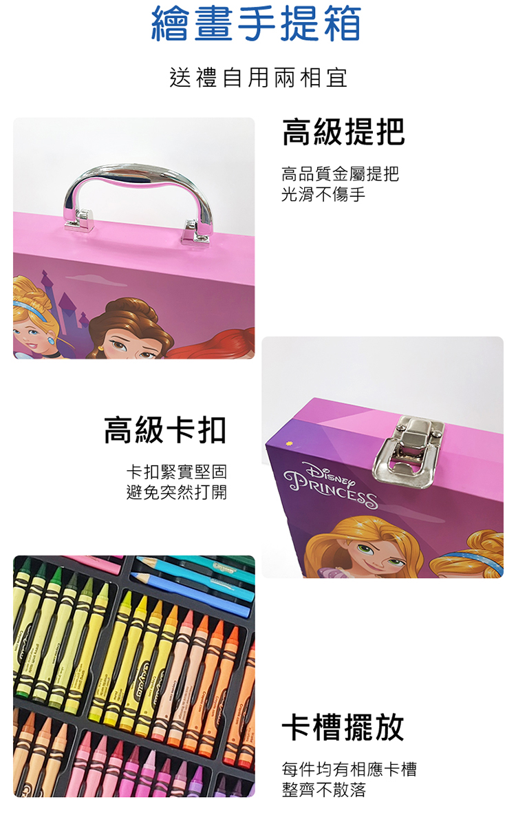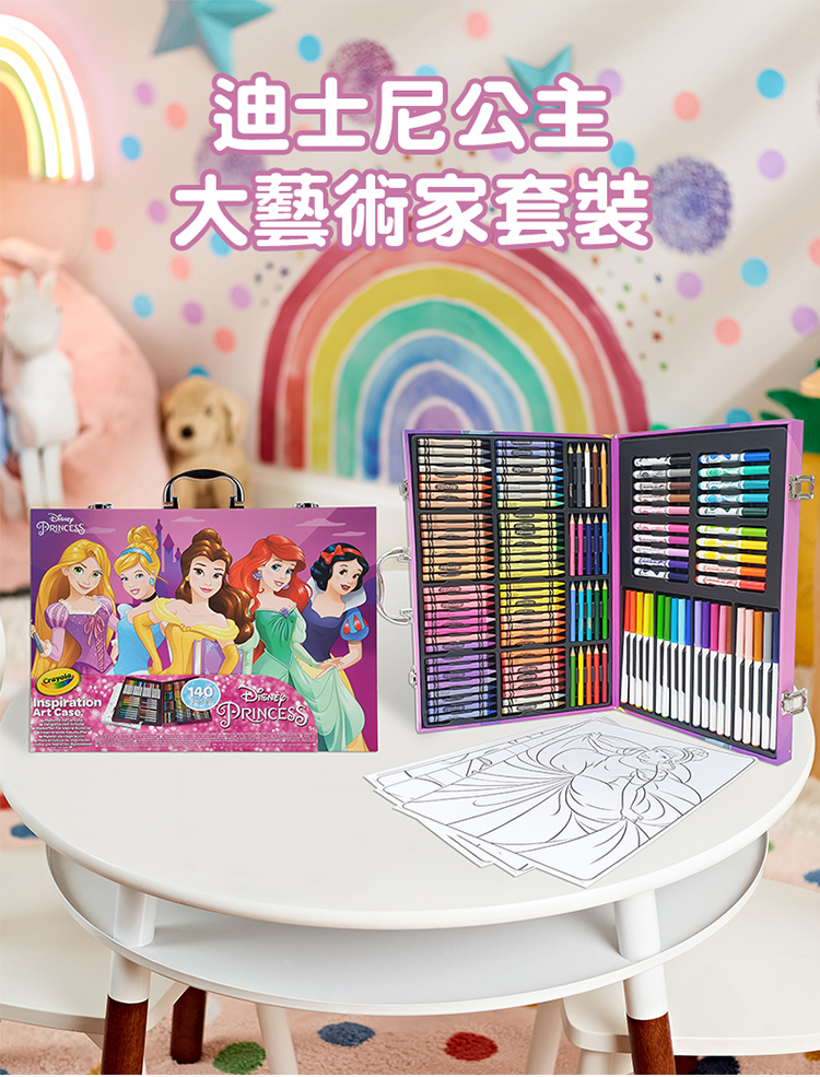 - 包含64支蠟筆、20支可水洗短桿彩色筆、20支可水洗細桿彩色筆、20支色鉛筆、15張迪士尼公主主題圖畫紙