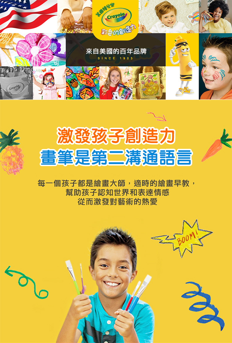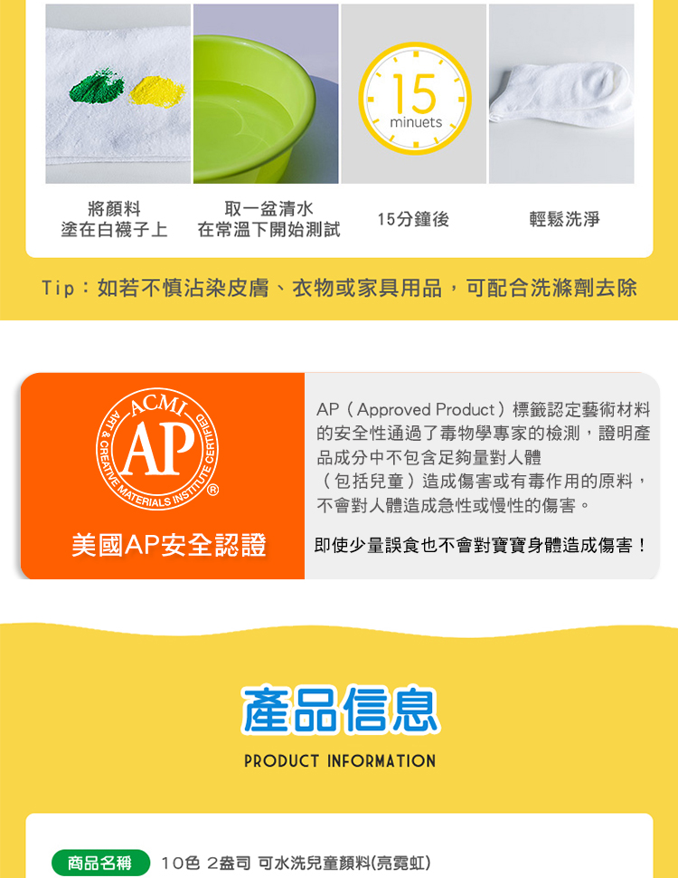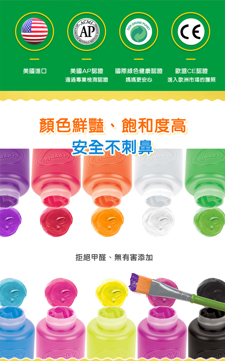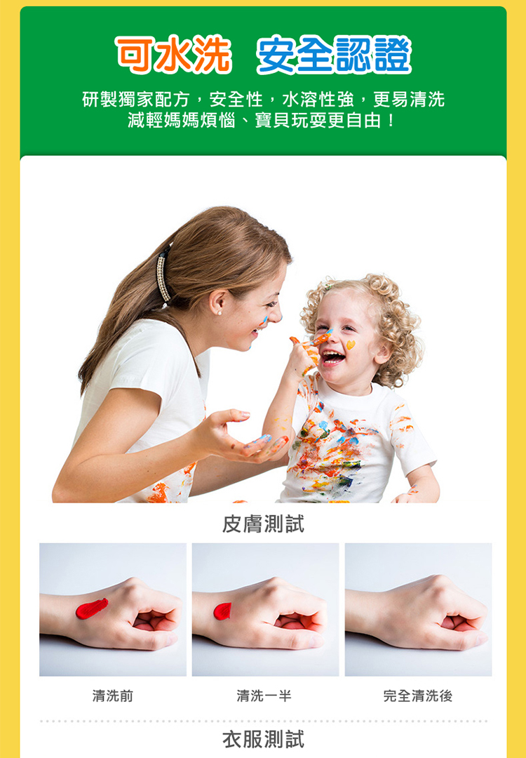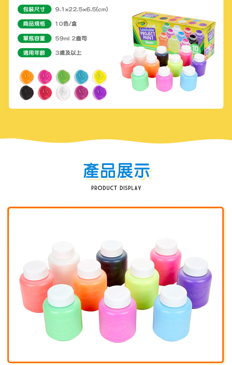 採用高濃縮顏料製成,色彩鮮豔、混色均勻,不同顏色可相互疊加 產品通過AP/CE 雙認證標章 可水洗顏料,塗抹於皮膚、衣服、傢俱,可立即以溫水清除洗淨,無需擔憂 ★ 產品尺寸(包裝):9x22.5x6.5cm ★ 適合年齡:3+ ★ 進口地(產地):美國 ★ 淨重:0.91kg ★ 材質:顏料