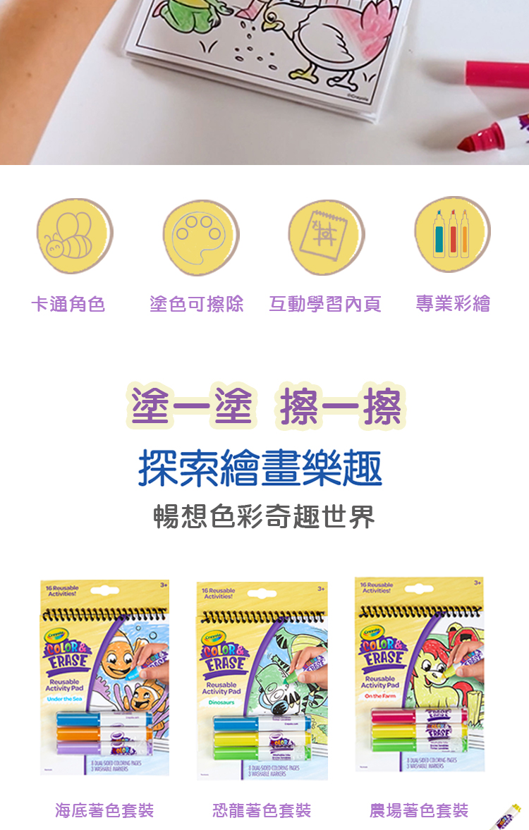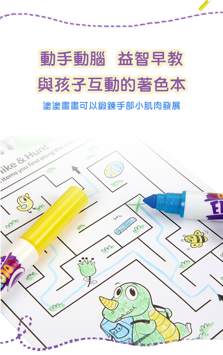 - 使用內附可水洗彩色筆著色,並可使用濕布輕鬆擦拭,重複擦畫與創作。