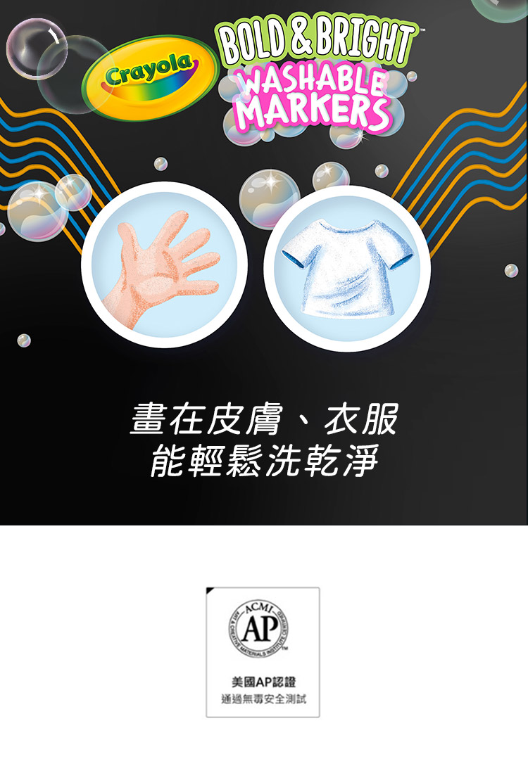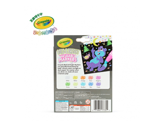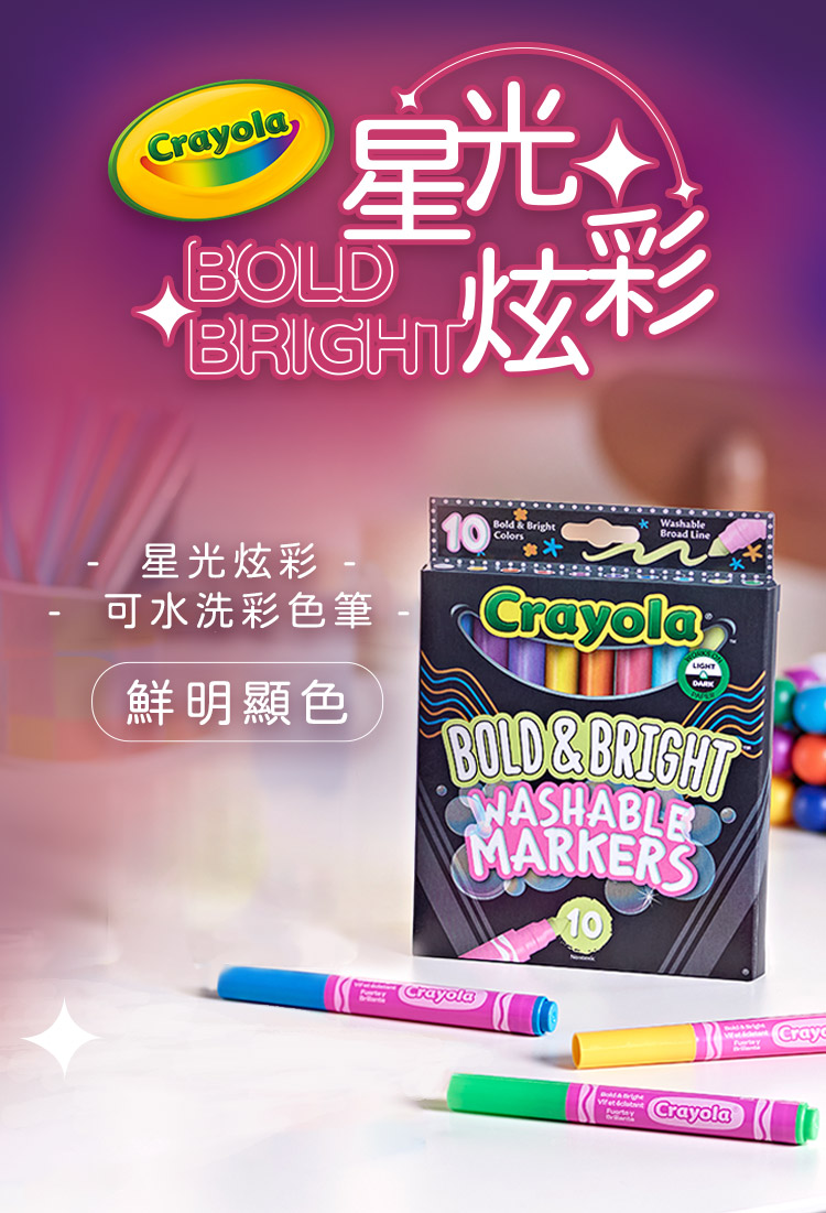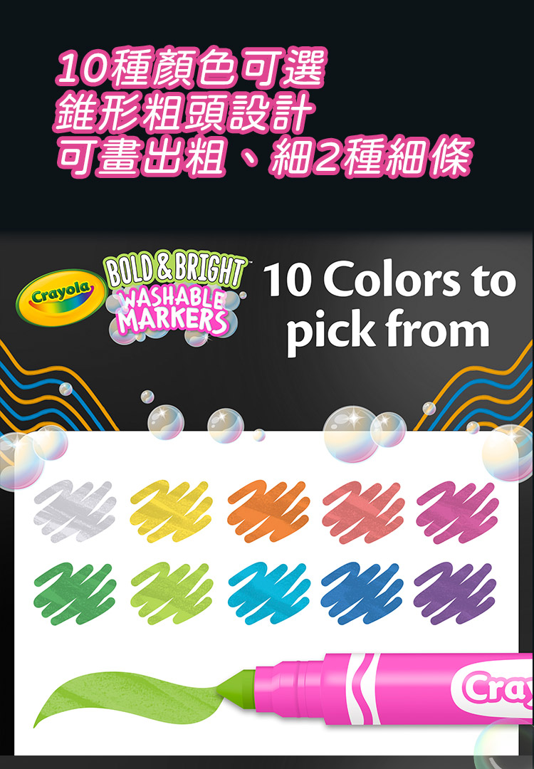錐形粗頭設計可畫出粗細兩種線 均適用於淺色與深色紙上,著色於深色紙、牛皮紙袋等更顯現星光炫彩顏色 世界最強可水洗性,畫在皮膚、衣服、牆壁上也能輕鬆洗乾淨 AP/CE雙認證 ★產品尺寸(包裝):14 x 1.9 x 19cm ★ 適合年齡:3Y+ ★ 進口地(產地):美國 ★ 淨重: 0.13kg