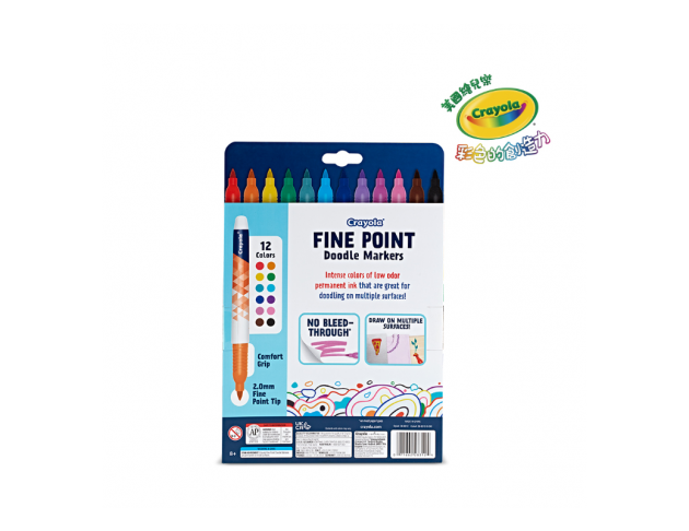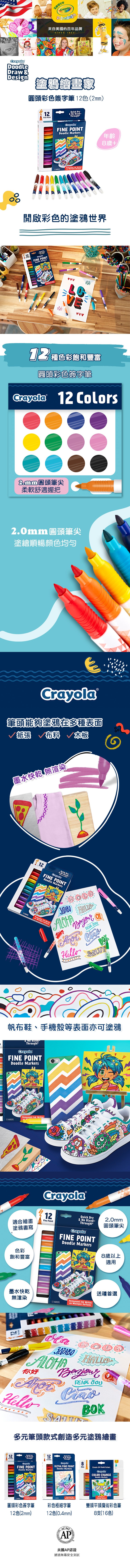 ●色彩飽和豐富,適合繪畫、塗鴉與書寫創作 ●2.0mm圓頭筆尖,柔軟舒適握把 ●塗繪順暢顏色均勻,墨水快乾無渲染 ●可彩繪在布料、木板、紙張等材質發揮創作 ●產品具有AP安全認證,安全性通過毒物學專家檢測 ★產品尺寸(包裝):2.30 x 18.10 x 26.35cm ★ 適合年齡:8Y+ ★ 進口地(產地):中國 ★ 淨重: 0.19kg
