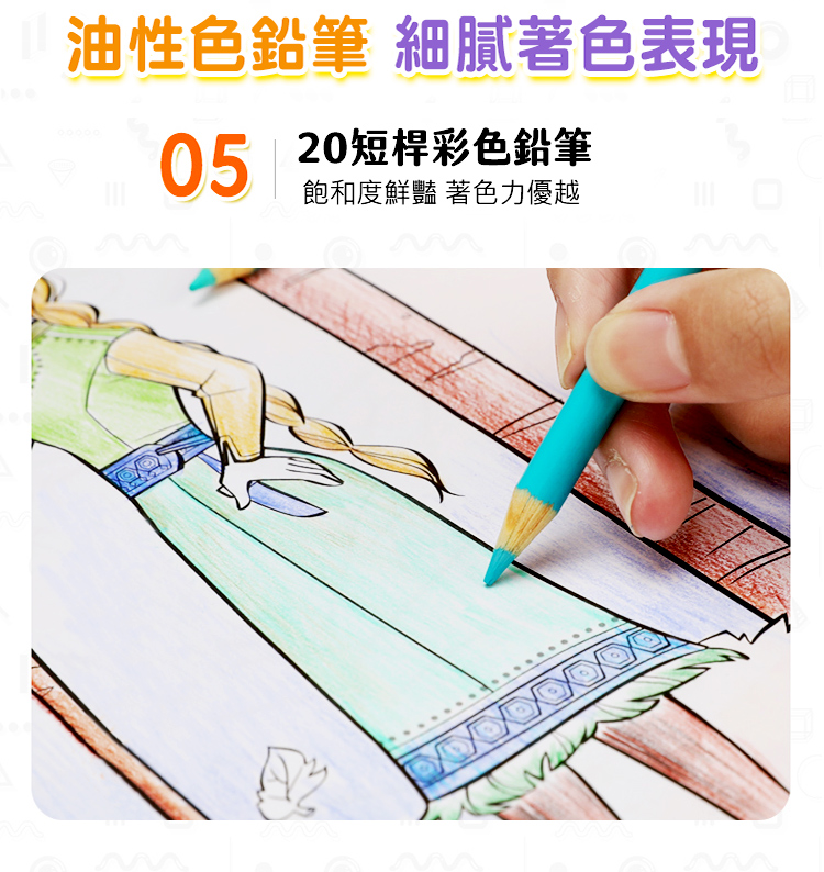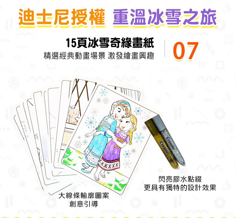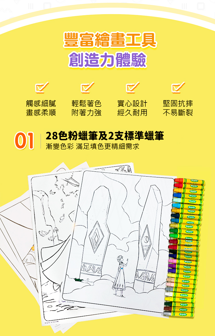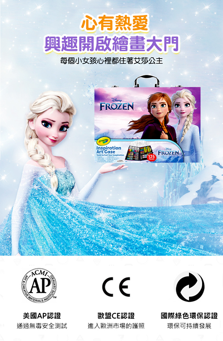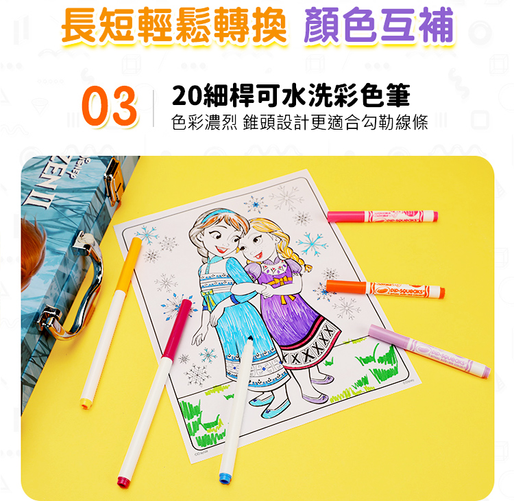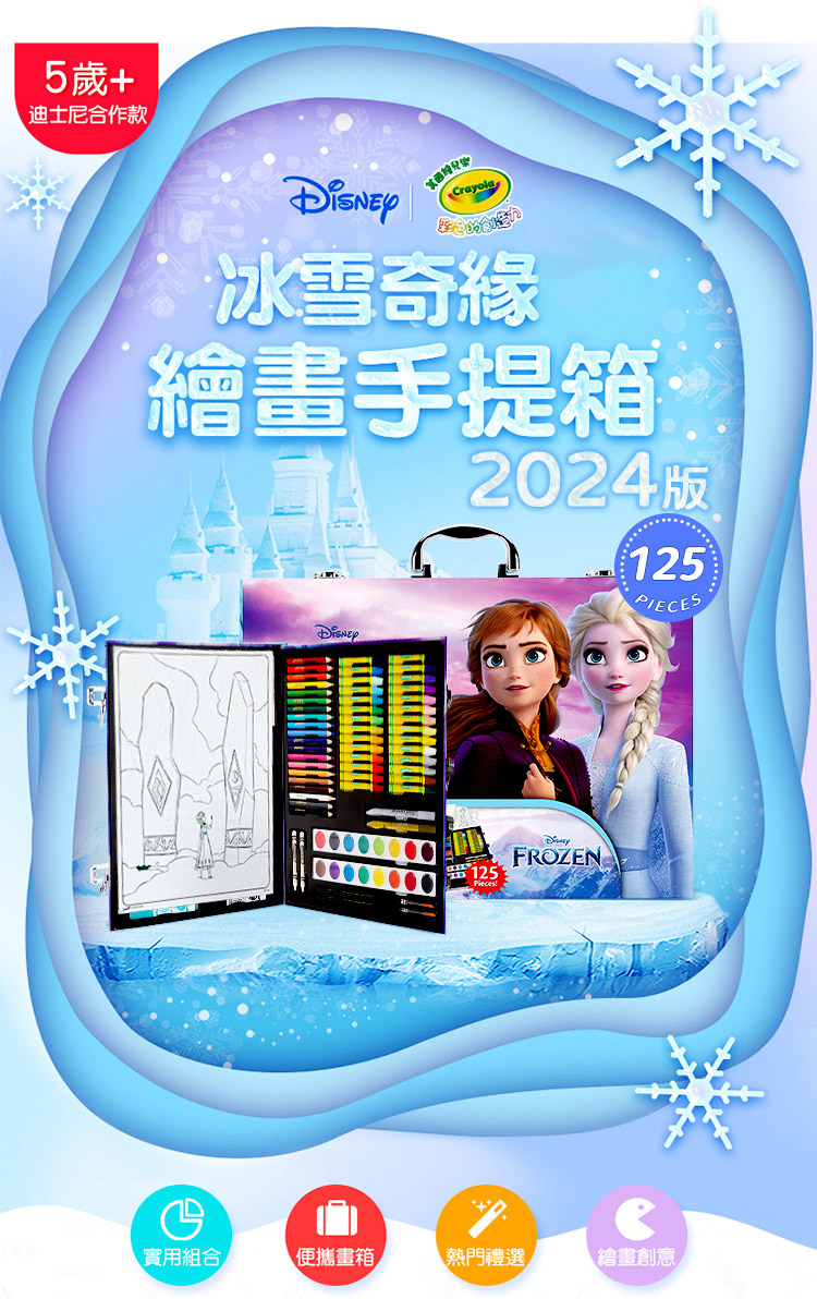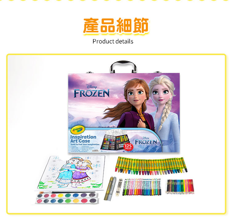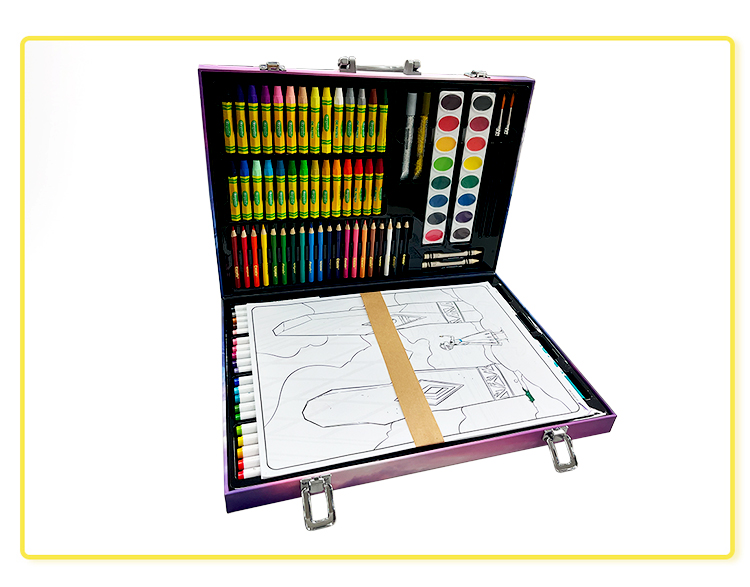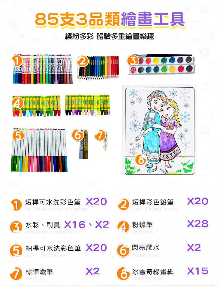 - 包含蠟筆、彩色筆、色鉛筆、水彩顏料、刷具、閃亮膠水