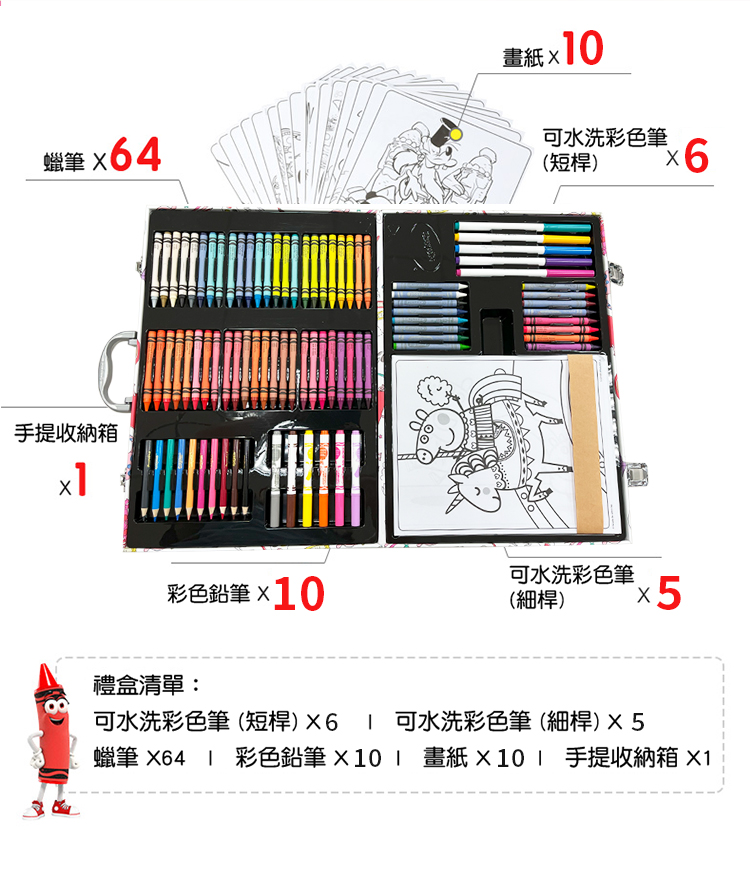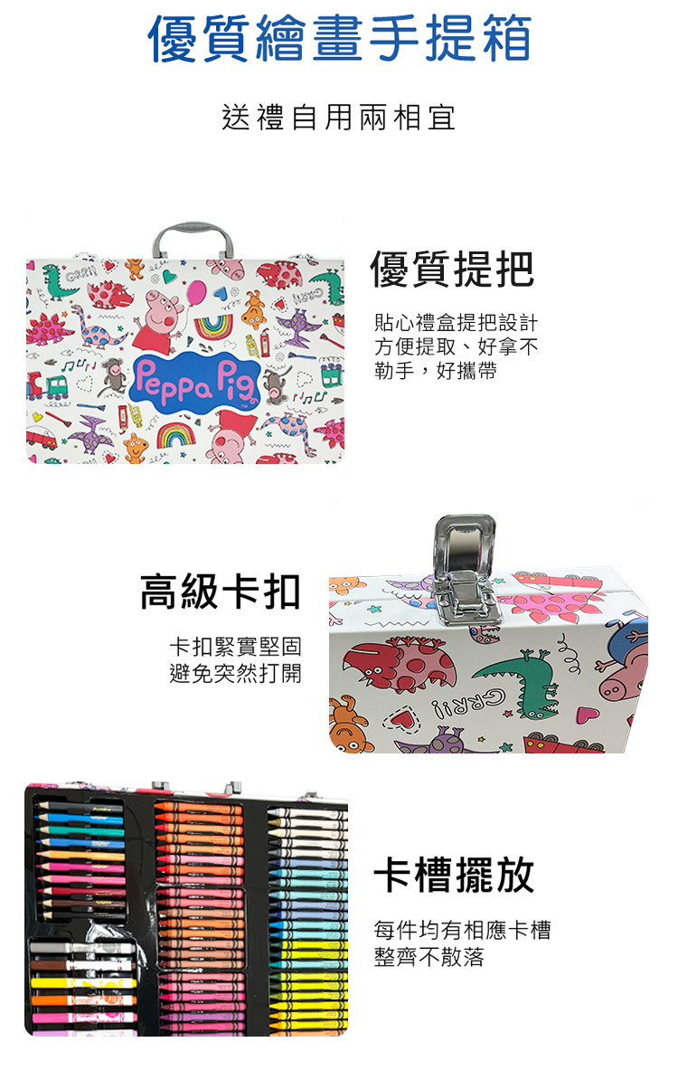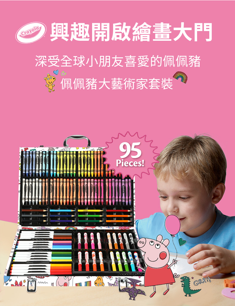 風靡全球的佩佩豬為主題 送禮自用兩相宜 包含蠟筆、彩色筆、色鉛筆 10張佩佩豬主題圖畫紙 可水洗彩色筆,可立即以溫水清除洗淨,無需擔憂留下痕跡 產品具有AP安全認證,通過毒物學專家檢測 ★ 產品尺寸(包裝):39.53 x 5.18 x 29.52cm ★ 適合年齡:5Y+ ★ 進口地(產地):越南 ★ 淨重:1.54kg ★ 保存年限:5年